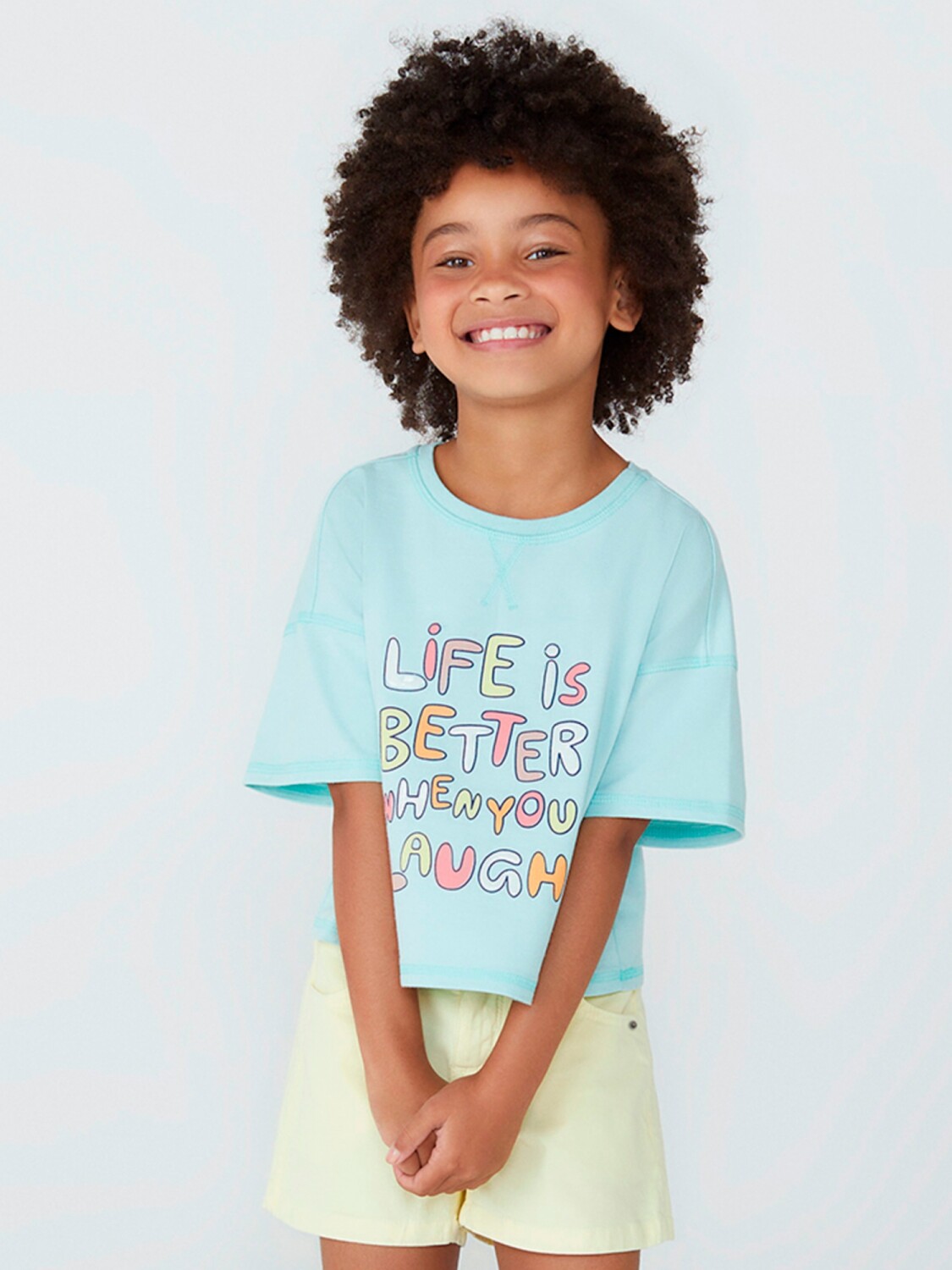 BLUSA CROPPED DE NIÑA CON ESTAMPA - CELESTE