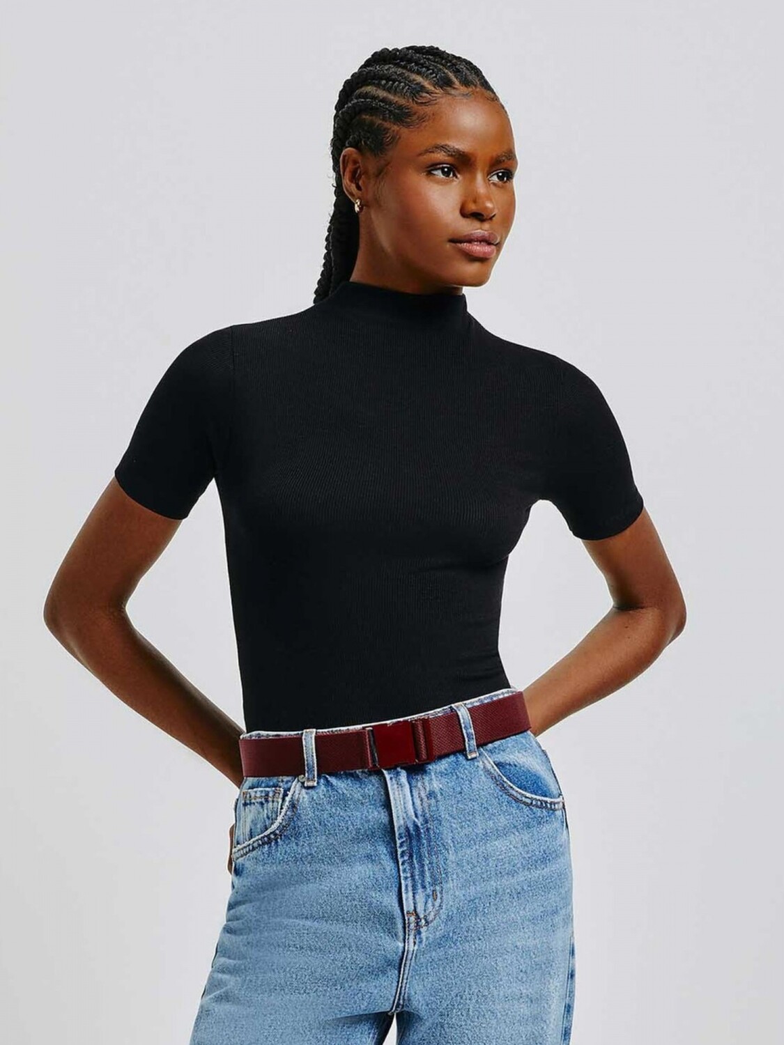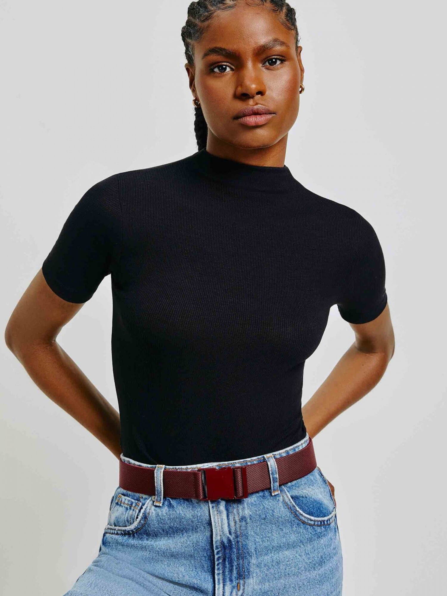 Blusa básica con cuello alto en tela acanalada. Confeccionado en viscosa y elastano, ofrece suavidad y flexibilidad, asegurando un perfecto ajuste al cuerpo. Esta pieza forma parte de nuestra línea de básicos. Son prendas imprescindibles y versátiles que pueden combinarse entre sí y combinar con todo tu armario.