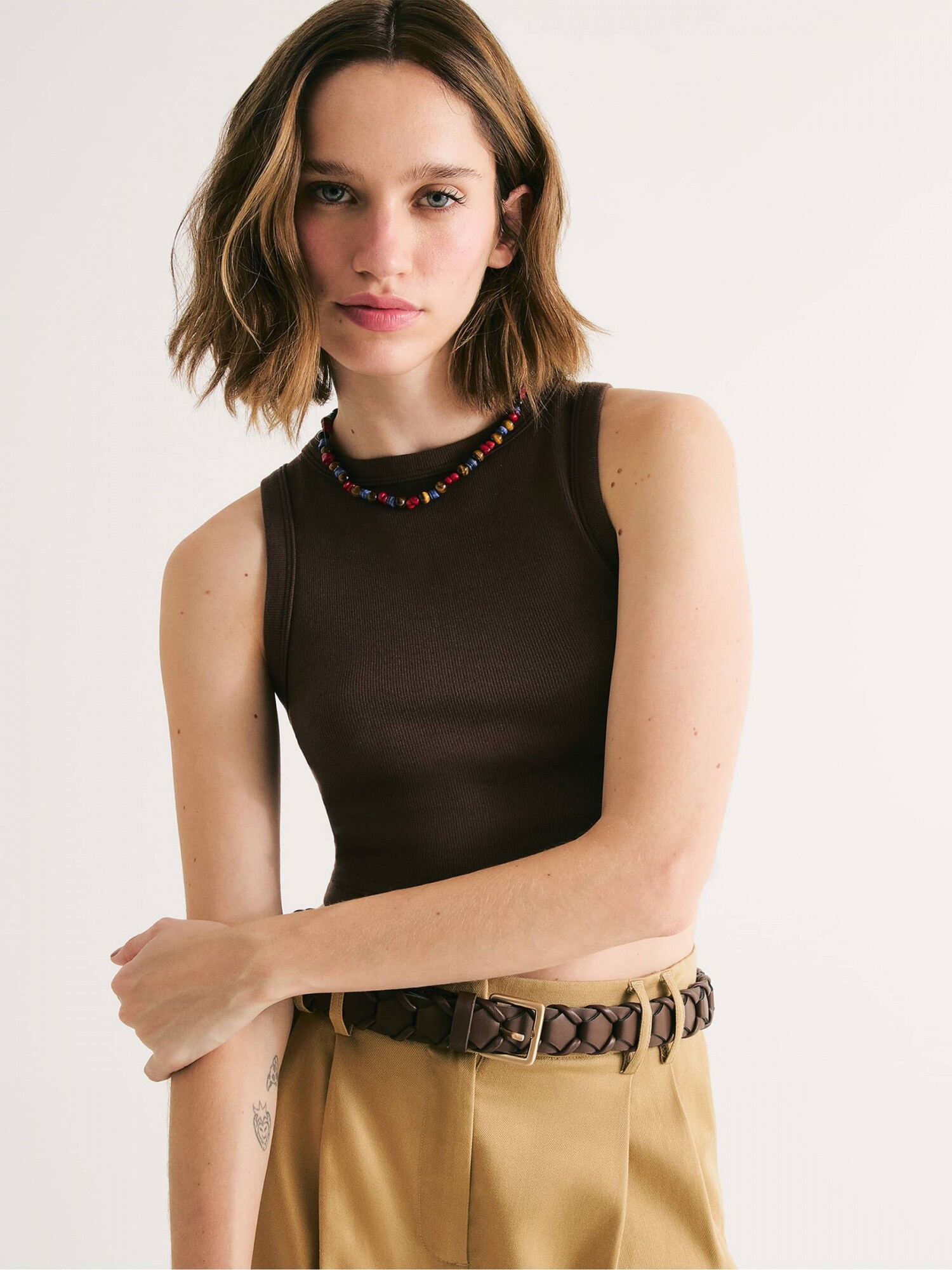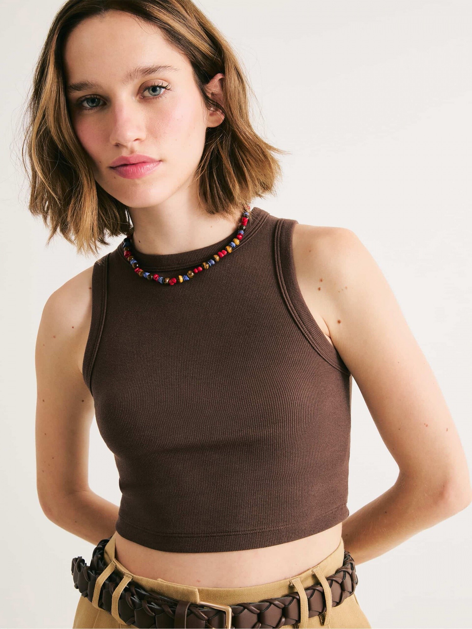 MUSCULOSA CROPPED FEMENINA EN TELA ACANALADA - MARRÓN