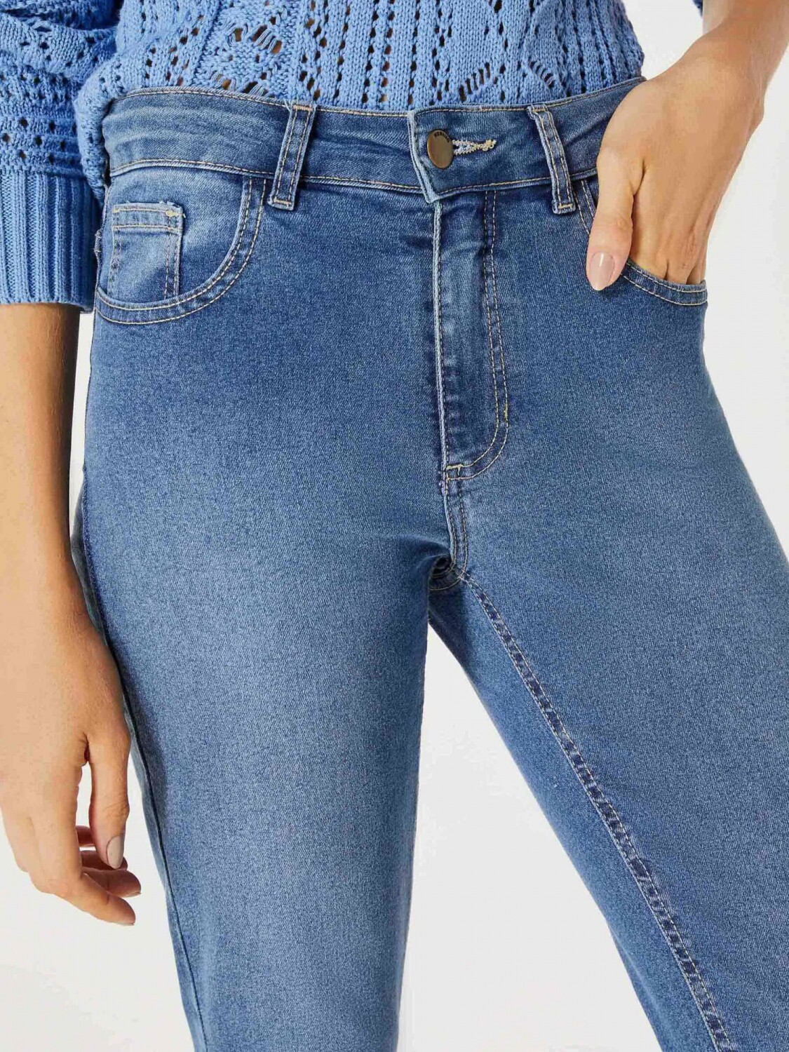 Pantalón de jean de cintura media, un clásico en cualquier look. Confeccionado en denim con elastano, tiene una silueta ajustada. Esta pieza forma parte de nuestra línea de básicos. Son prendas imprescindibles y versátiles que pueden combinarse entre sí y combinar con todo tu armario.